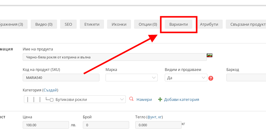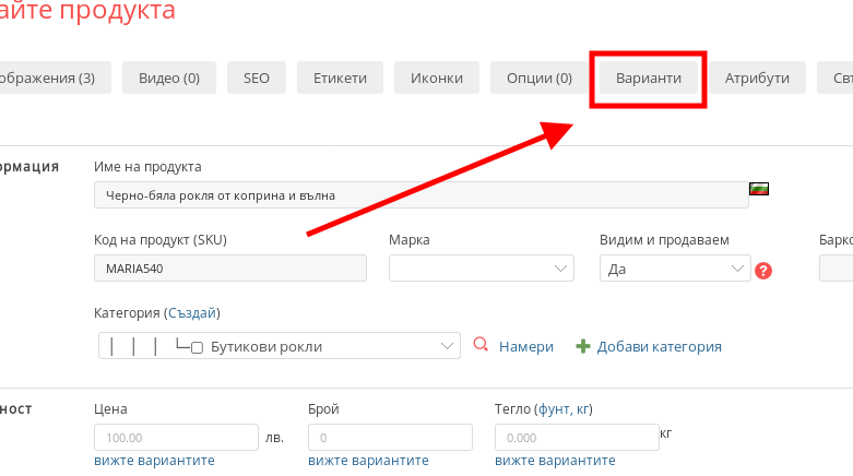 - Отидете в продукта, на който желаете да зададете новосъздадения Вариант и отидете в меню “Варианти”.