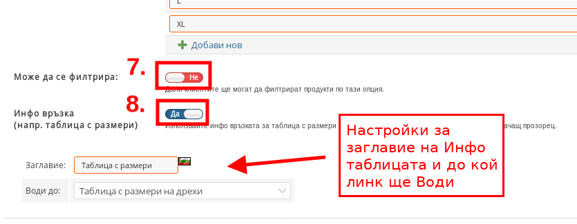 - С настройката “Инфо връзка” можете да добавите инфо връзка, която ще се отвори в pop-up (изскачащ) прозорец - например, ако продавате дрехи или обувки, чрез тази настройка можете да добавите изскачащ прозорец с размерите в него.