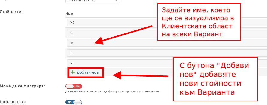 - В поле “Стойности” задавате името на всички продуктови Варианти, които възнамерявате да използвате. За да създадете нови стойности използвайте бутона “Добави нов”.
