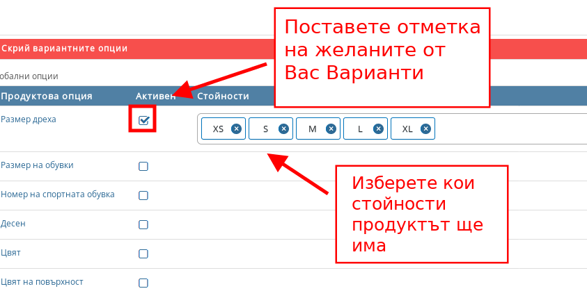 - Изберете Варианта, който искате да приложите върху продукта като му поставите отметка и изберете кои стойности да използва той.