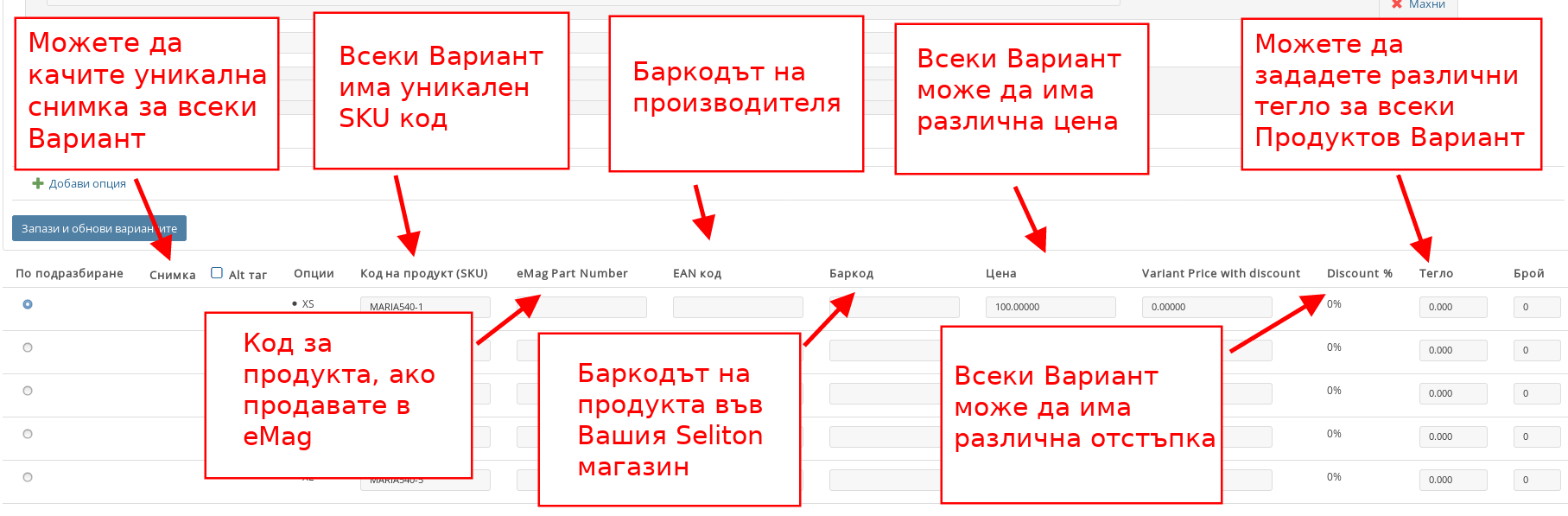 - Остава единствено да настроите характеристиките на всеки Продуктов вариант: