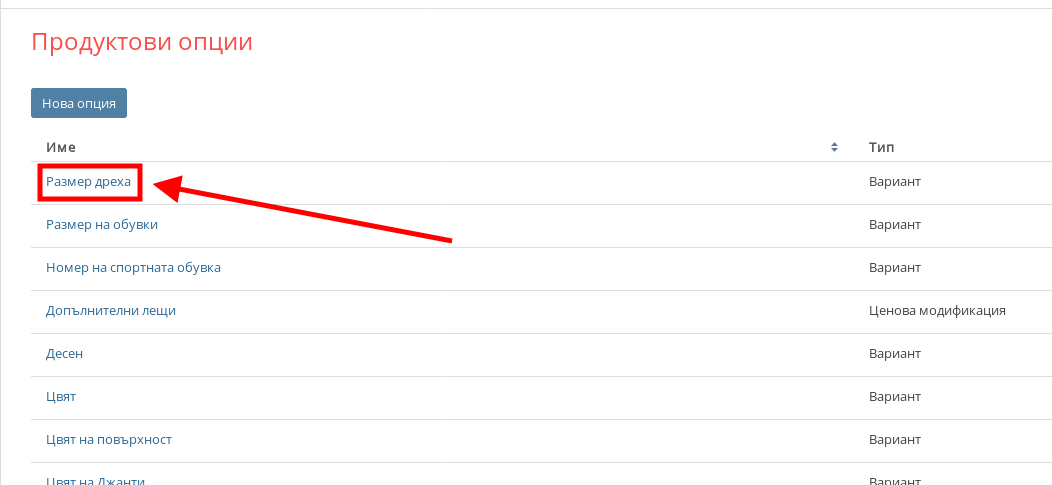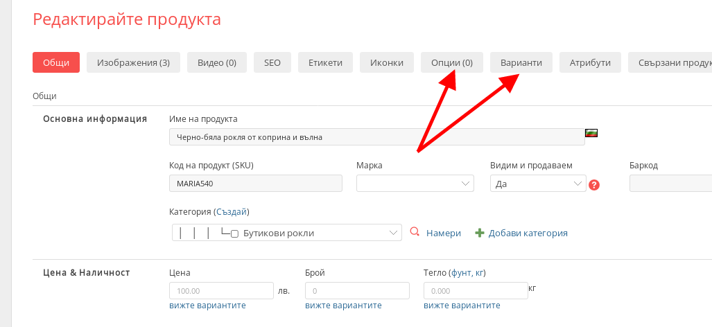 - След като сте в настройките на продукта натиснете върху меню “Опции” или “Варианти” в зависимост коя от двете настройки искате да редактирате.