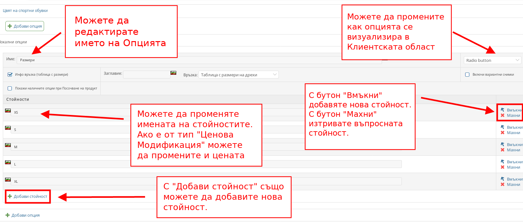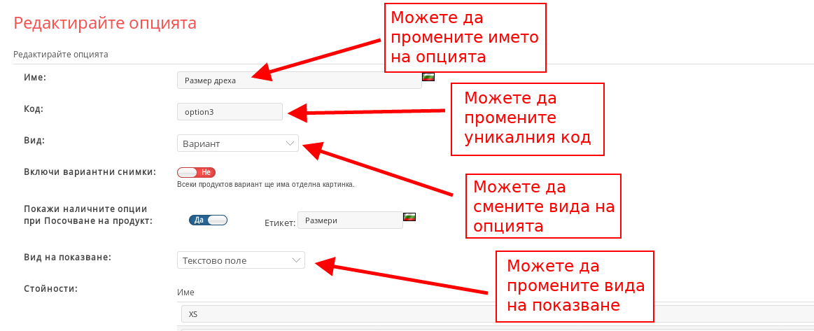 - Можете да редактирате Името на Продуктовата Опция, Вида на показване, Имената на стойностите, ако е от вид “Ценова Модификация” да промените цената, както и да добавяте и премахвате стойности.