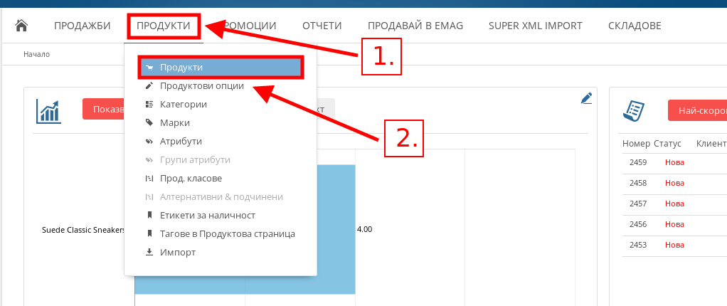 - Отидете в меню Продукти и натиснете върху подменюто със същото име – "Продукти".