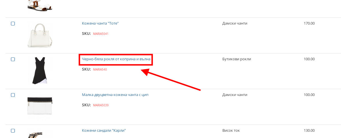 - Влезнете в продукта, в който искате да редактирате опциите или вариантите – можете да направите това като натиснете върху името му или върху иконката на синя писалка в десния край на реда му.