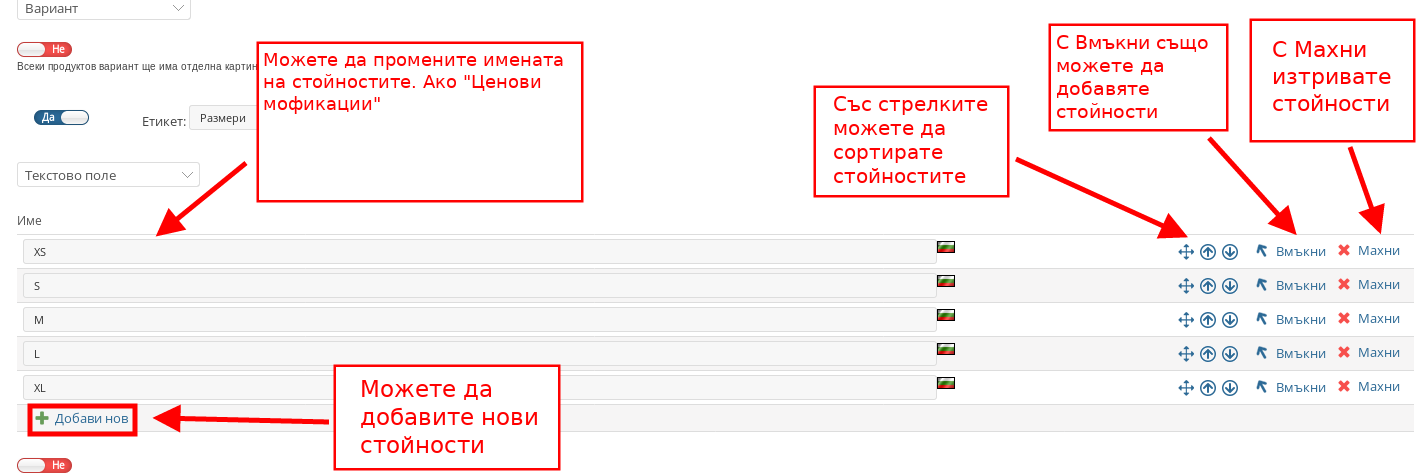 - Mожете да редактирате и стойностите на Продуктовата опция, като можете да добавяте, изтривате или променяте стойностите.