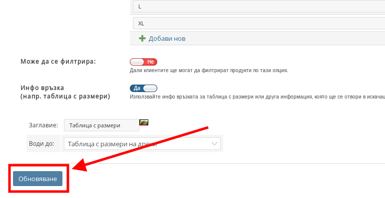 Когато сте готови с редакцията на Продуктовата Опция натиснете бутона “Обновяване” за да запазите промените си.