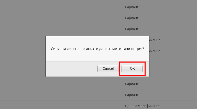 - След като натиснете бутона “X” ще се появи pop-up (изскачащ) прозорец, в който да потвърдите дали сте сигурни, че искате да изтриете Продуктовата опция.