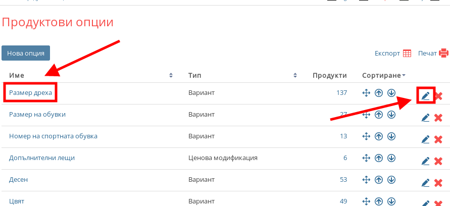 - Отворете списъка си с Продуктови опции и отворете Опцията, от която искате да премахнете стойности. Може да направите това като натиснете върху името на опцията или в дясната част на нейния ред натиснете върху иконка с форма на синя писалка.