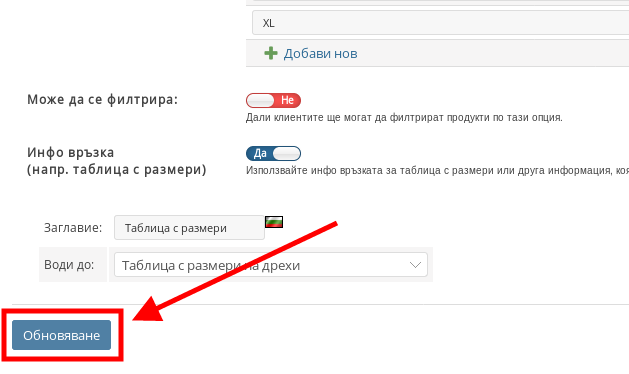 След като изтриете стойностите, които не искате да бъдат в Групата от Продуктови Опции, запазете промените си като натиснете бутона “Обновяване” в долния ляв ъгъл.