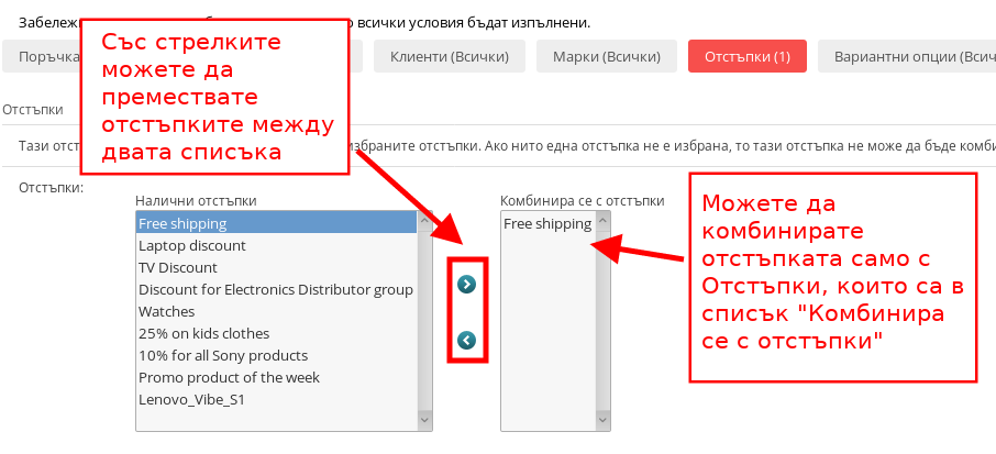 В това условие можете да комбинирате отстъпки за клиентите Ви. В този случай, ако искаме да създадем -20% отстъпка за всички женски рокли в отстъпката, която създаваме, можем към нея да добавим и отстъпката “Безплатна доставка” и по този начин ще можем да комбинираме и двете отстъпки върху избраните продукти.