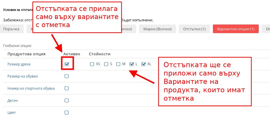 С това условие можете да приложите Отстъпката си само върху продукти, които имат конкретни Вариантни опции, като можете да приложите и отстъпката върху само определени Варианти. Примерно, ако продавате рокли и искате да приложите отстъпка от -20% само за роклите с размер L и XL, избирате Продуктовия Вариант, който използвате за роклите и избирате Вариантите, върху които искате да приложите отстъпката (в този случай L и XL). Отстъпката е приложима само върху Глобални Варианти.