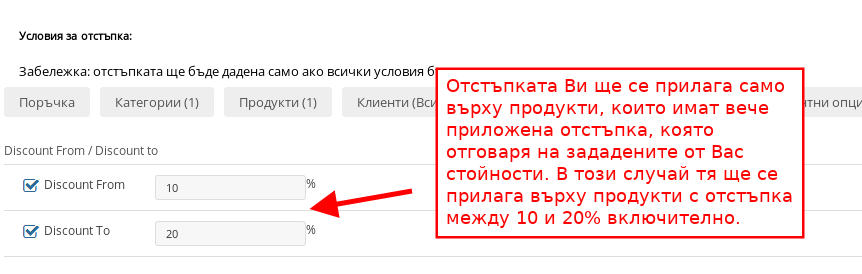 Можете да прилагате условията за отстъпка чрез раздели Поръчка, Категории, Продукти, Клиенти, Марки, Отстъпки, Вариантни опции и Discount From/ Discount To.