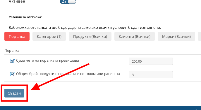 След като сте готови с настройването на Вашата отстъпка, натиснете бутона “Създай” в долния ляв ъгъл.