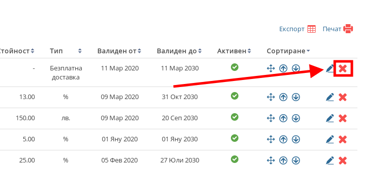 Ако искате да изтриете дадена отстъпка можете да направите това от списъка с "Отстъпки" като натиснете червения бутон "X" в дясната част на реда на отстъпката.