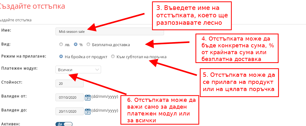 - С бутона “Активен” Вие включвате и изключвате промоцията. Имайте предвид, че единствено активните отстъпки се визуализират в клиентската област. Когато създавате отстъпка не е нужно да я активирате веднага, Вие можете да я активирате на по-късна дата само с един клик в настройките ѝ.