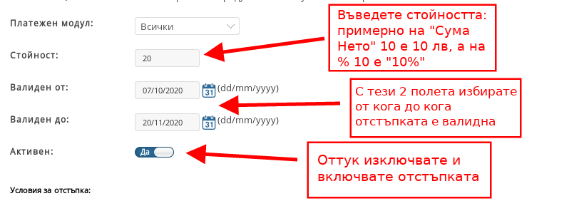 - С падащото меню “Платежен модул” избирате дали отстъпката да бъде валидна само за конкретен платежен модул или за всички, които Вашият магазин поддържа.