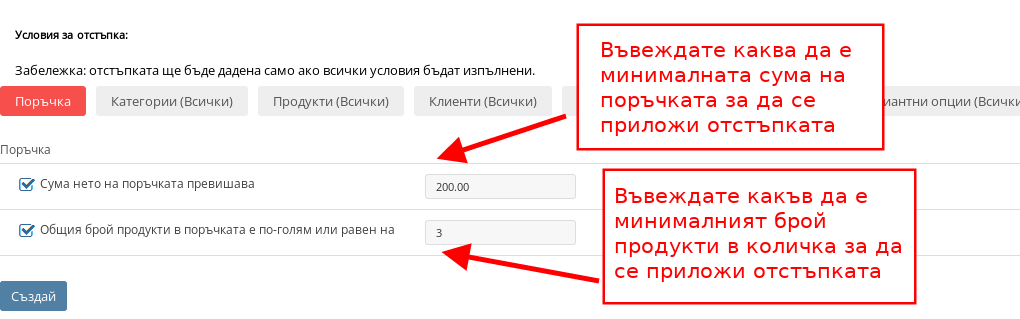 Върху всяка Отстъпка могат да бъдат приложени и ограничения. Вие можете да ограничите Вашето предложение за намаление според минималната стойност на поръчката, върху кои категории да се прилага тя, върху кои продукти, както и други опции.