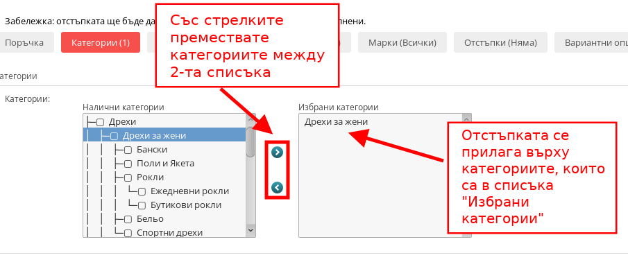С това условие управлявате върху кои категории от продукти да се прилага отстъпката. Отстъпката ще е достъпна за клиента, само когато той купува продукти от избраните от Вас категории. Промоцията се прилага само върху категориите, които попадат в списък “Избрани категории”.