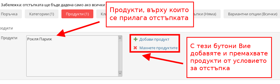 В раздел продукти Вие управлявате отстъпката, така че тя да се прилага само и единствено върху определени продукти. Отстъпката е достъпна за клиента, само когато той купува избраните от Вас продукти. Добавяте продукти чрез бутон “Добави Продукт” и премахвате продукти чрез бутон “Махнете продуктите”.