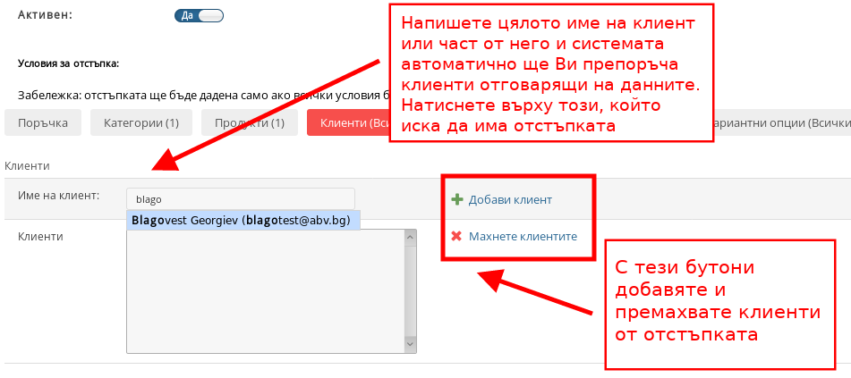Съвет: Можете да използвате условие “Клиенти” за да давате отстъпки на Ваши лоялни клиенти или пък като знак на добра воля за определени клиенти.