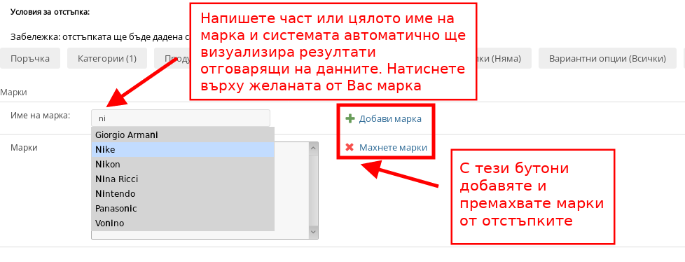 В раздел марки избирате дали отстъпката да бъде приложена само върху избрани от Вас марки, примерно ако искате да приложите -20% отстъпка на всички артикули на Nike за определен период от време. За да използвате условието, напишете името на марка (цяло или част от него) в текстовото поле и системата ще визуализира всички марки, които отговарят на въведените от Вас данни. Натиснете върху марката, която искате да добавите и след това натиснете върху бутона “Добави марка”