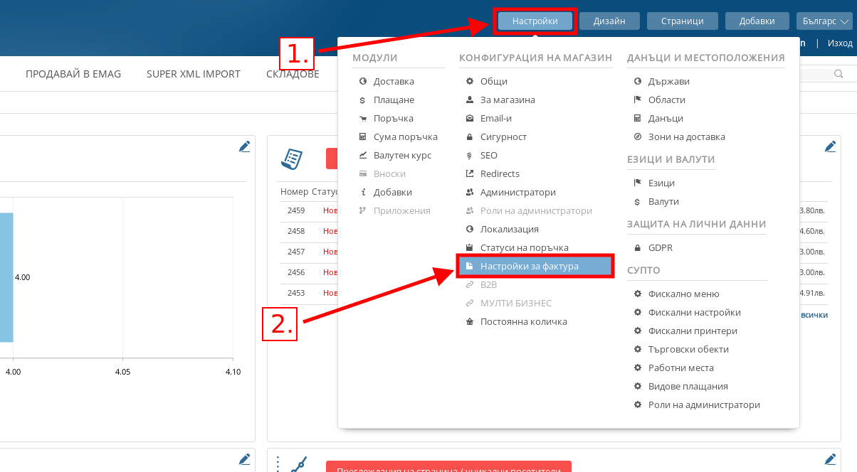 - Във Вашия административен панел посочете меню Настройки и натиснете върху подменю “Настройки на фактура”.