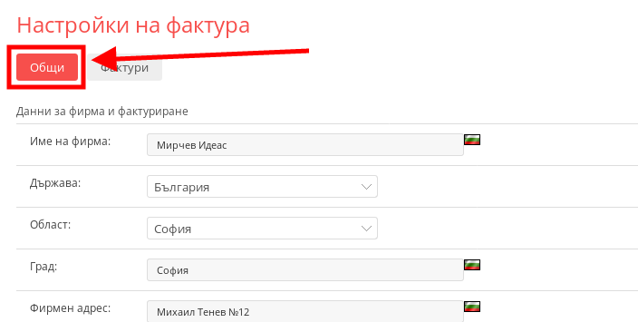 - Първото меню, в което ще попаднете е “Общи”. В него можете да зададете Данни по подразбиране за Вашата фирма при съставянето на фактури.