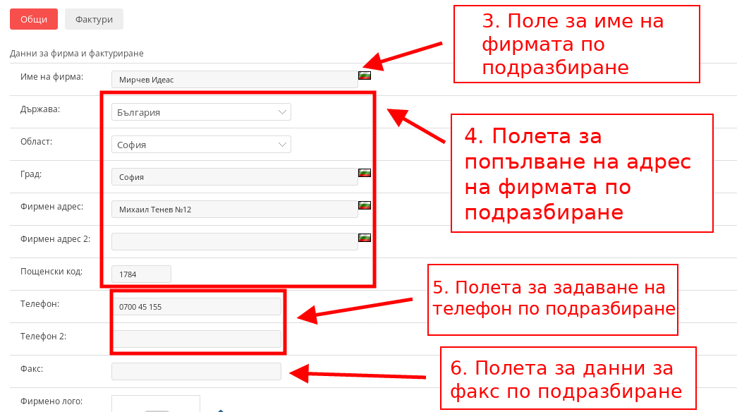 - В полетата за адрес “Държава”, “Област”, “Град”, “Фирмен Адрес” и “Пощенски код” задавате адреса по подразбиране на Вашата фирма.