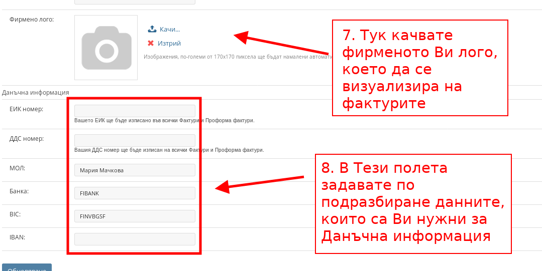 - В полето “Фирмено лого” можете да качите Вашето фирмено лого, което да се визуализира върху фактурите, които издавате.
