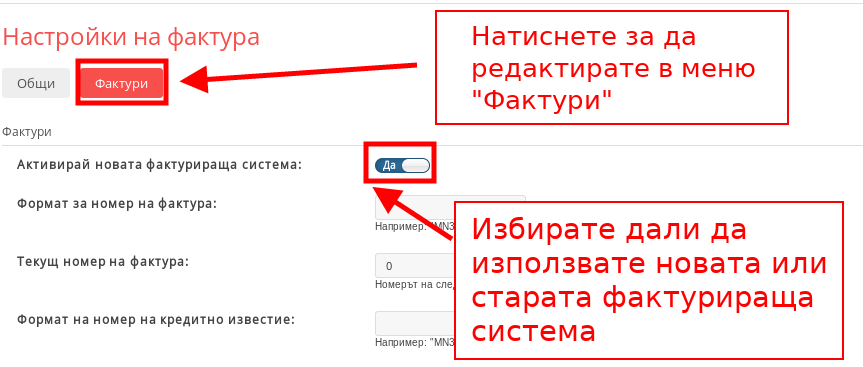 - За да изберете второто меню "Фактури" натиснете върху панел "Фактури" до "Общи". Първата настройка, която ще видите е “Активирай новата фактурираща система”. С нея избирате дали да използвате старата или новата версия за фактуриране.
