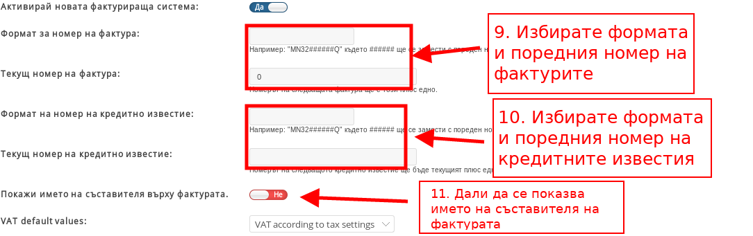 - В полета “Формат за номер на фактура” и “Текущ номер на фактура” задавате какъв да е форматът на поредния номер на фактурата Ви и задавате поредните номера на фактурите да се начисляват автоматично.