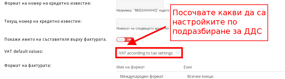 - С настройката “VAT Default Settings” посочвате дали в цената на продуктите е включено ДДС-то и по какъв начин системата да посочва цената на продуктите във фактурата: