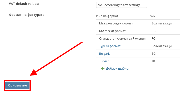 След като сте готови с редакцията на “Настройки за фактура” натиснете бутона “Обнови” в долния ляв ъгъл.