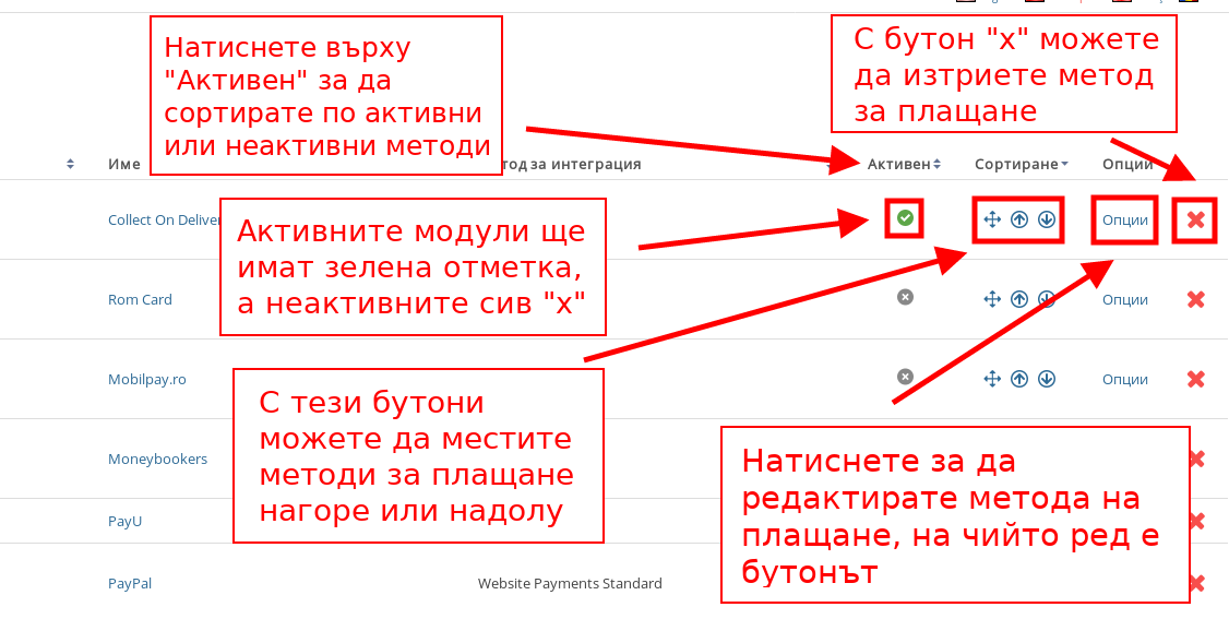 - В списъка с модули за плащане имате множество опции, с които да ги управлявате с лекота: