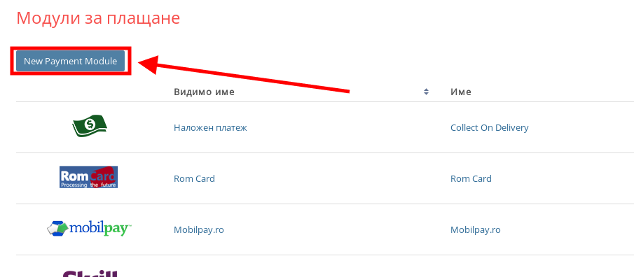 - За да добавите метод за плащане натиснете върху бутона “New Payment Module”.
