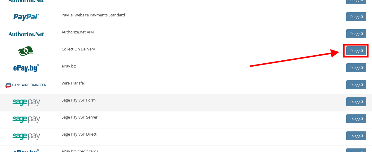 - След това ще се отвори списък с всички модули за плащане, интегрирани във Вашия Seliton магазин. Намерете този, които търсите и натиснете върху бутона “Създай”.