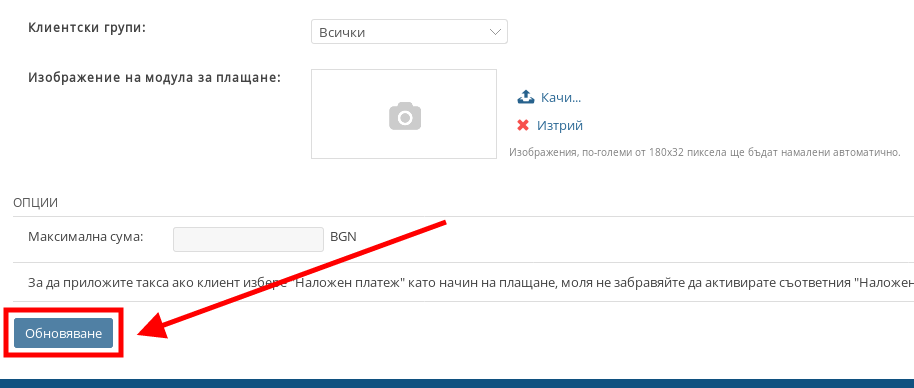- След като натиснете “Създай”, методът вече е добавен във Вашия магазин, като Вие ще бъдете препратени в настройките му. След като сте приключили с настройването натиснете върху бутон “Обновяване”.