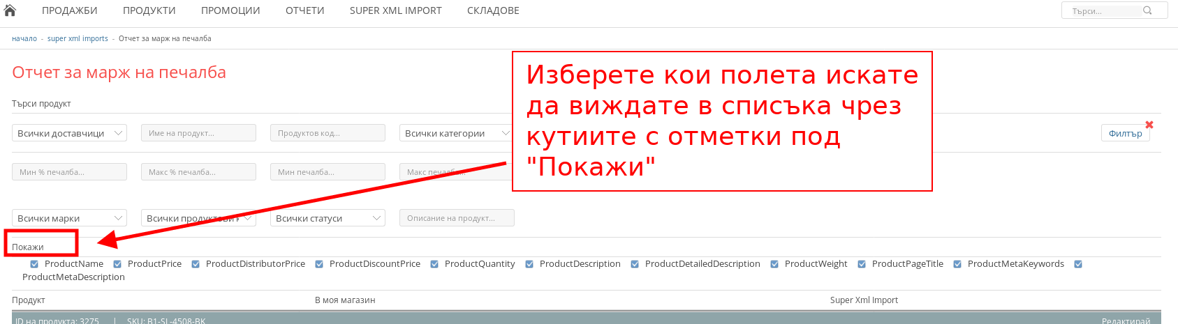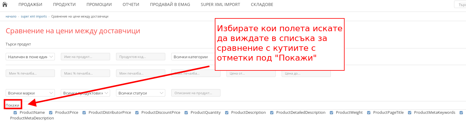 - С кутиите под “Покажи” можете да избирате кои полета искате да виждате в списъка с продукти. Можете да избирате да виждате име на продукта, цена на продукта, дистрибуторска цена на продукта, намалена цена, количество, описание, подробно описание, тегло, заглавие на продуктова страница, мета ключови думи и мета описание.