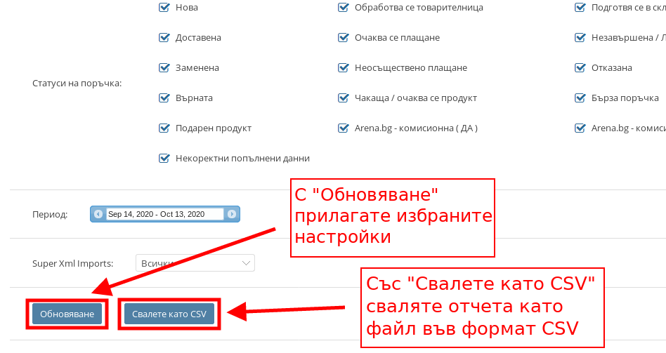 Ако сложите отметка на “Статуси за поръчка” можете да посочите продуктите в кои статуси да бъдат включени в отчета.