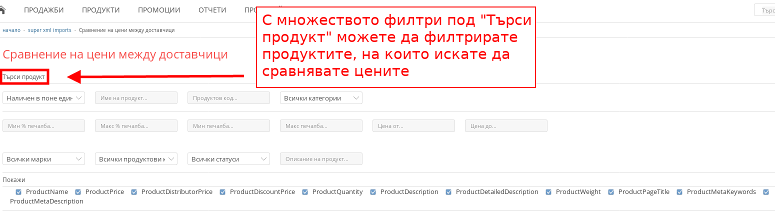 - С филтрите под “Търси продукт” можете да филтрирате на кои продукти искате да сравните цените на доставчиците. Можете да филтрирате какъв е минималният брой доставчици в които продуктът е наличен за да се визуализира в списъка, от кои категории да се взимат продукти, кои марки, продуктови класове и статути на продуктите. Можете и да търсите продуктите по име, продуктов код, минимален % печалба и максимален % печалба, минимална печалба и максимална печалба като посочено число, цена от колко до колко и по описание на продукт;
