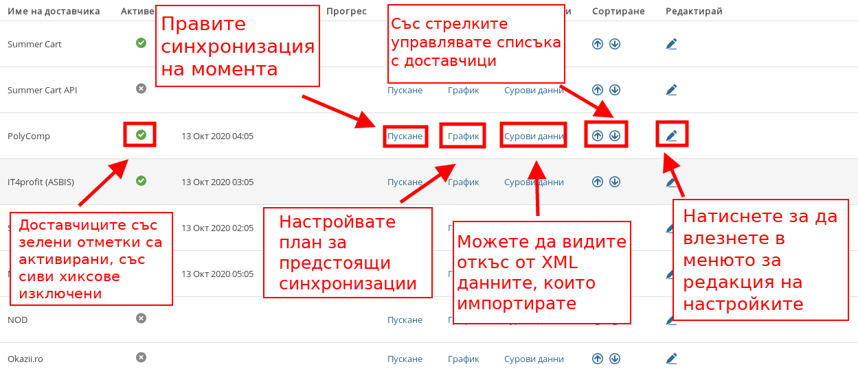 - В меню “График на синхронизациите с доставчици” можете да настройвате и управлявате предстоящи синхронизации:
