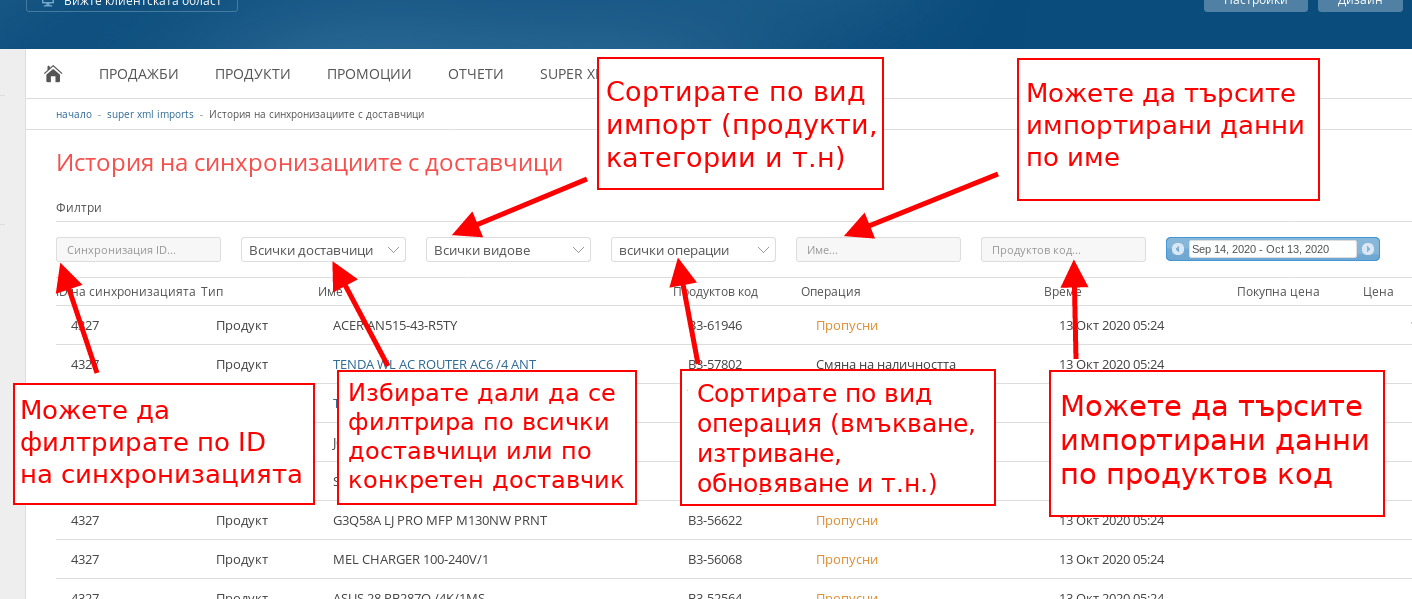 - Можете да сортирате импортираните данни по ID на синхронизацията, доставчици, вид на импорт (продукти, категории, атрибути и т.н.), каква е била операцията (вмъкване, изтриване и т.н.), име на продукти и продуктов код;