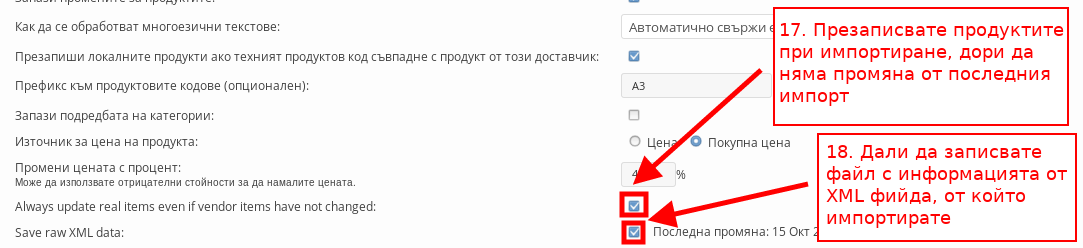 - С “Обнови всички продукти, дори ако доставчикът не ги е променил” Вие правите форсирана синхронизация, с която всички данни от XML фийда се наливат във Вашия магазин и презаписват тези на текущите Ви продукти, ако има съвпадения между каталога Ви и XML фийда.