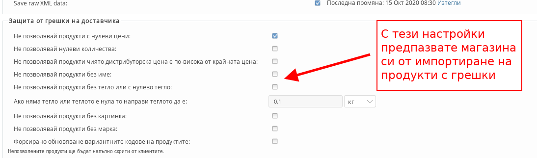 - С настройките под “Защита от грешки на доставчика” задавате настройките при импортиране на данни да пропускат продукти, в които има грешка – нямат количество, цена, тегло и т.н. Отметките за защита биват: