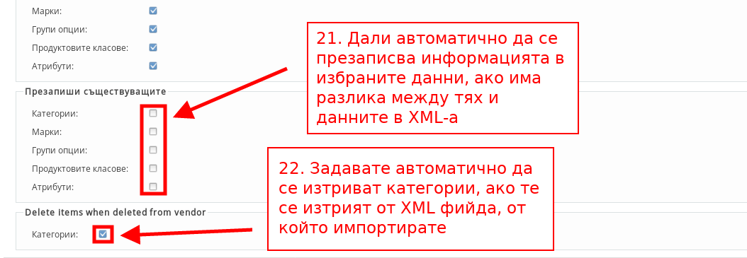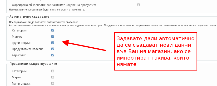 - С настройките под “Презапиши съществуващите” настройвате дали автоматично да се презаписват категории, продукти, опции, продуктови класове или марки, ако в тези, които се наливат от XML фийда има промени, в сравнение с тези, които са във Вашия магазин.