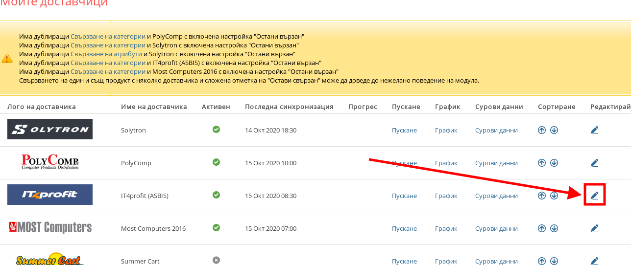 - За да влезнете в настройките на модул ASBIS натиснете върху иконката във форма на синя писалка в дясната част на реда му.