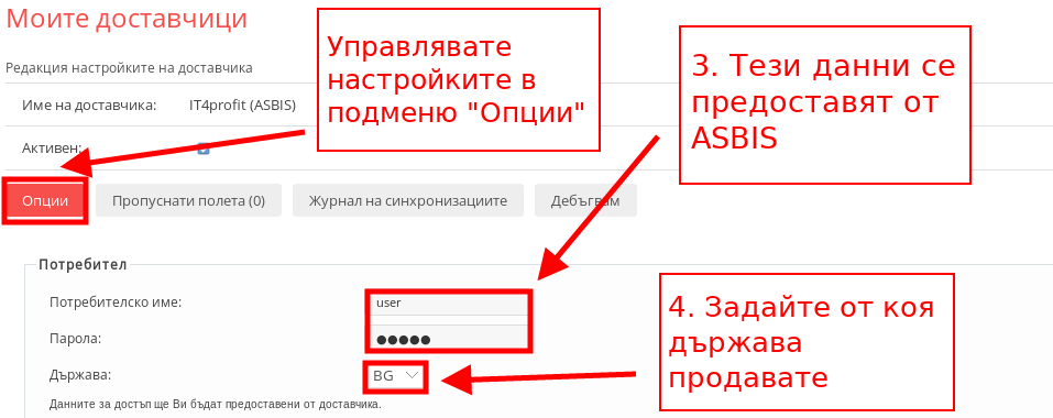 - Първите 2 реда “Потребителско име” и “Парола” са данни за достъп, които получавате директно от ASBIS за да се синхронизирате с тях. След като ги получите, попълнете данните в отговарящото на тях поле.