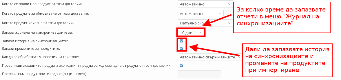 С настройките с отметки “Запази История на синхронизациите” и “Запази промените на продуктите” задавате дали да запазвате история на синхронизацията и дали да се запазват детайли за промените в продуктите, когато ги импортитате.
