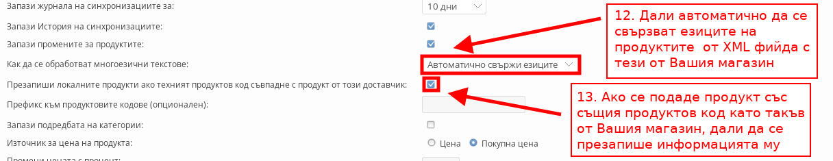 - “Провери продуктите в магазина, не само данните от доставчика” - С тази настройка преди да извърши синхронизацията, системата проверява всички продукти от Вашия магазин, не само тези от XML фийда.